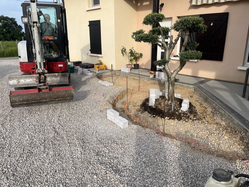 EMDE, votre artisan a réalisé un Aménagement extérieur : création d’un massif décoratif avec délimitation en pavé en pierre naturelle de Côte d’Or à Bletterans.